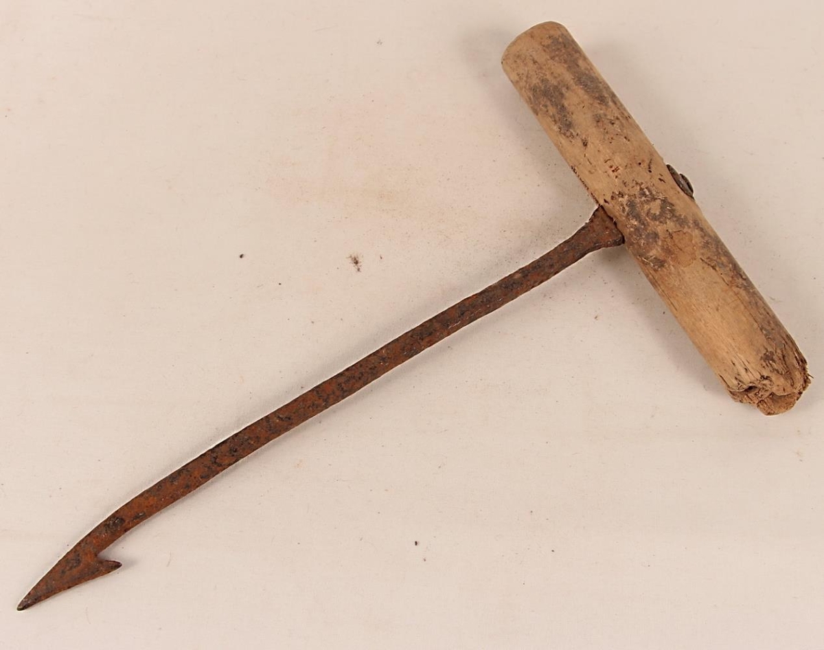 Heykrókur. Lengd 33,5 cm. Járnið er 1 cm að breidd og 8 mm að þykkt. Einn krókur. Hald úr furu sem er 3,5 cm í þvermál og 20,5 cm langt, járnið gengur í gegnum miðju haldsins og krókurinn er samhliða haldinu.