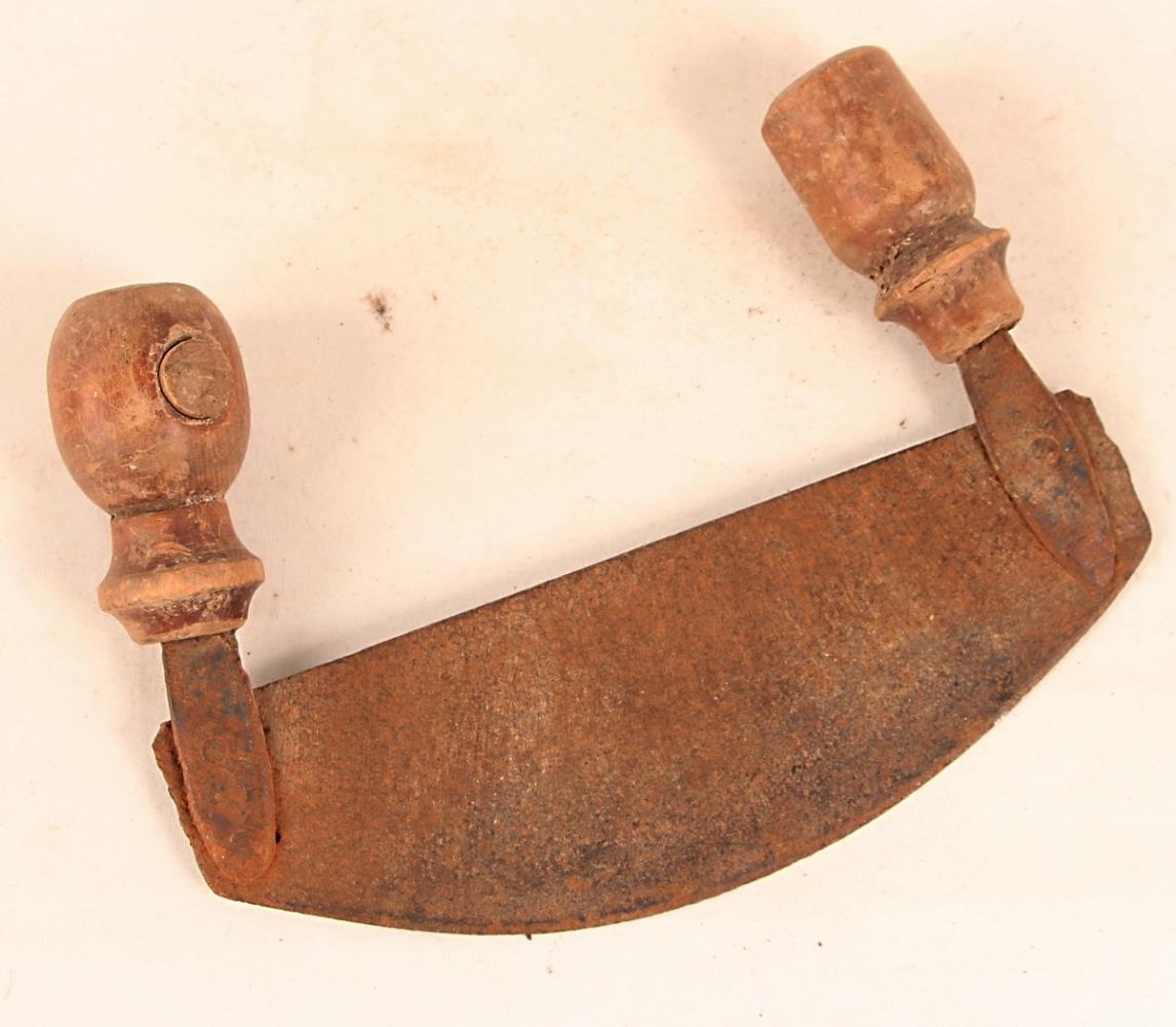 Tóbaksjárn úr járni með tveimur ólíkum tréhnúðum á hvorum enda. Annar hnúðurinn er nær hringlaga með tappa í miðjunni, hinn er með sléttan enda og jafnar hliðar. Á neðri hluta beggja hnúðanna er renndur kantur, en hvor með sínu lagi. Járnið er ryðgað og bitlaust.