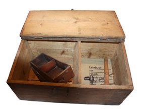 Kistill með hlutum með fylgjahlutum fyrir prónjavélina. Prjónavél Hand Rundstrick Maschine Söru Ólafsdóttur en eiginmaður hennar Bergur Arnibjörnsson keypti vélina nýja í Reykjavík árið 1935. Hefur hún verið í eigu hennar síðan. Þau hjónin gáfu Byggðasafninu prjónavélina í febrúar 1975.