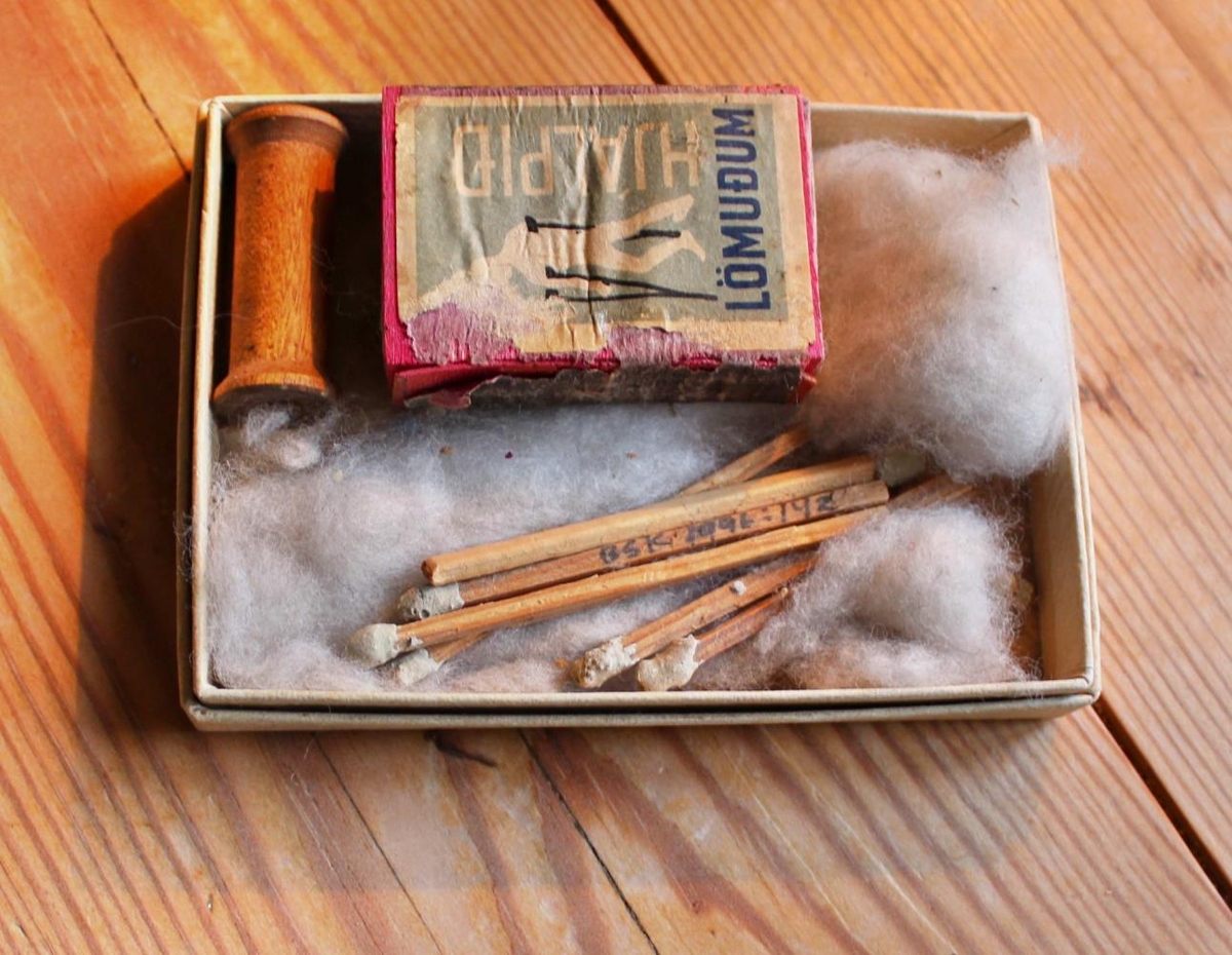 Níu eldspýtur úr furu og brennisteinni frá Þeystareykjum í Þingeyjarsýslu.