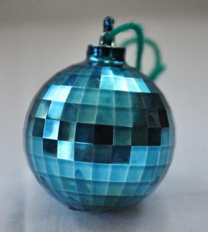 Jólaskraut. Blá kúla úr gleri, um 5 cm í þv. Kúlan er með óteljandi sléttum flötum, líkist diskókúlu. Var keypt um 1960 í Versluninni Varmalæk.
