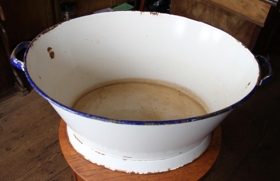 Þvottabali úr járni, hvítemaljeraður, eyru og barmrönd eru blá. Sporöskjulaga 49 x 60 cm. Mjókkar niður. Stendur á stétt. Neðan á er blár stimpill +- Osló. Mesta lengd milli eyrna er um 70 cm. Balinn var notaður til allkyns þvotta jafnvel baðferðir barna og fullorðinna. Síðast var hann notaður til að brynna lambám í nokkur vor.