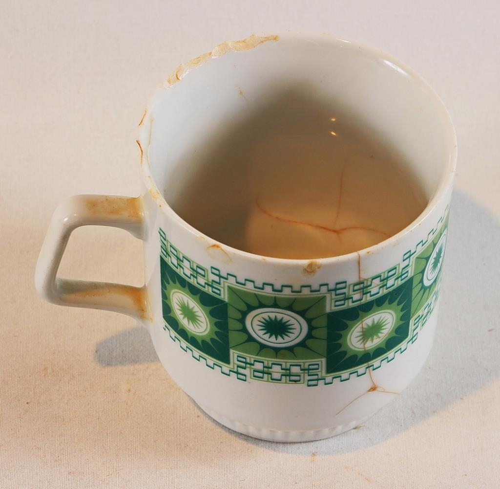 Bolli, hvítur með grænu símynstri. Nokkuð stór, 8 cm í þvermál, 8,5 cm á hæð. Neðan á botni er blár stimpill, kóróna með „D“ undir og neðan við það „CZECHOSLOVAKIA“.