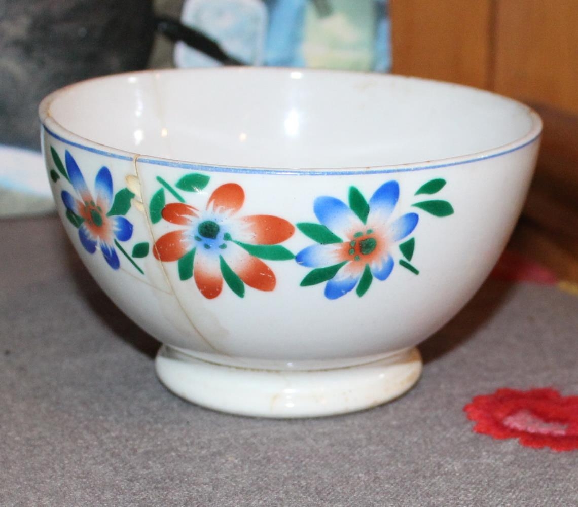 Skál úr leir, hvítmáluð grautarskál. Blá rönd er með brúnum. Þrjár rósir prýða skálina, tvær bláar og ein rauð með grænum laufum. Neðan af botni skálarinnar er grænn stimpill með myndum og letri: „SCRICHA...D (einn staf vantar) MADE IN ITALY - 35“. Skálin hefur einhvern tímann brotnað og verið límd saman. Þvermál hennar er 15 cm, hæð 8,5 cm.