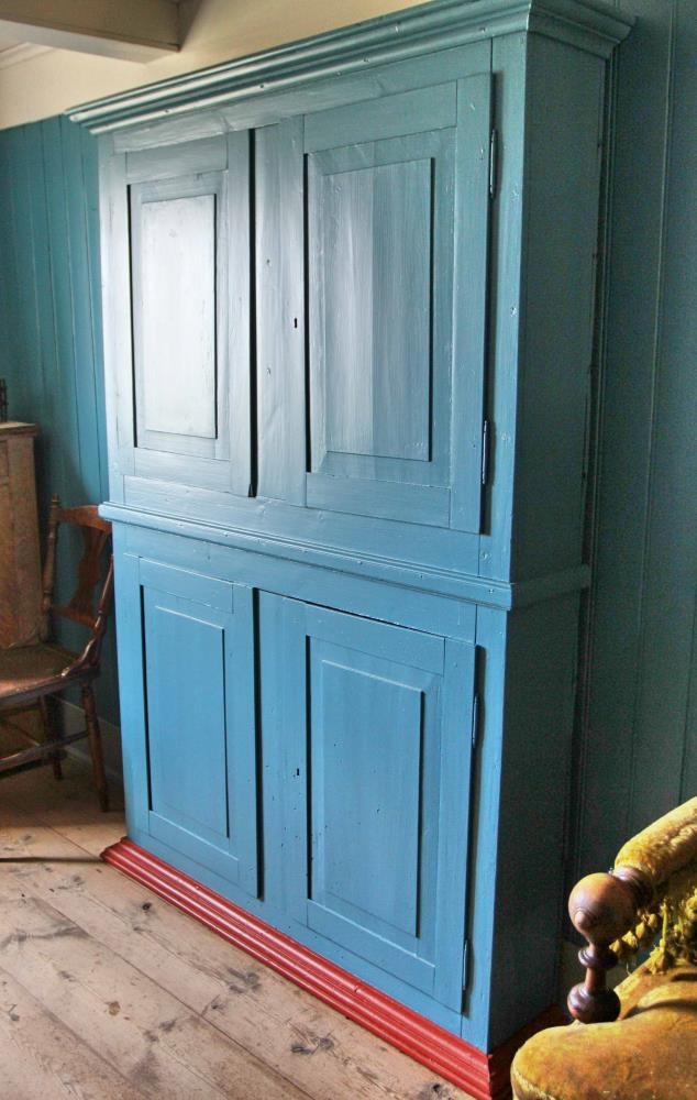 Stofuskápur úr furu, blámálaður, nokkuð mikið afmáður. Stærð 121 x 189 cm. Dýpt 22,5 cm. Neðst er brúnmáluð stétt, einnig er brík efst og er hún 132 x 29 cm. Bakið er úr borðvið sem sporað er saman. Efri og neðri skápur, báðir með tveimur hurðum og eru þrjár hillur í báðum. Hann er settur saman um miðju, rammi (úr listum) fellur ofan á og utan um neðri skápinn.
