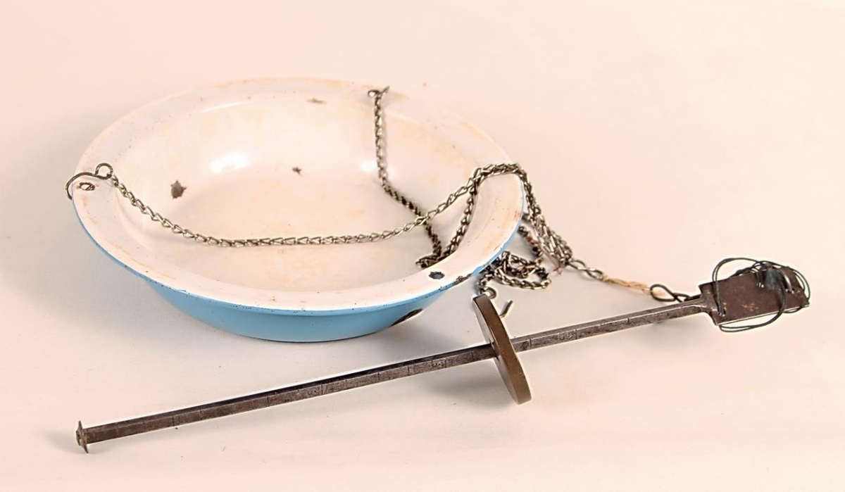 Vogarlóð, stöngin er úr járni með koparplötu, keðja úr járni og skálin er emaléruð. Ljósblá að utan og hvít að innan. Hún er 24 cm alls í þv. en innanmál er 20 cm og dýptin 4,5 cm. Stöngin sjálf er 36,5 cm löng og telur 1100 gr. Vogin var notuð aðallega við að mæla korn og aðra léttavöru sem tilheyrði búshaldi.