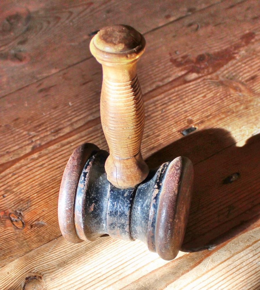 Bókbandshamar eða -sleggja, mjög þungur haus, hringlaga, 9 cm í þvermál og 10 cm á breidd á stuttu, um 13 cm löngu renndu tréskafti. Hamarinn hefur verið svartmálaður en er töluvert ryðgaður nú, af aldri, og skaftið er töluvert sprungið og úrkvarnað.