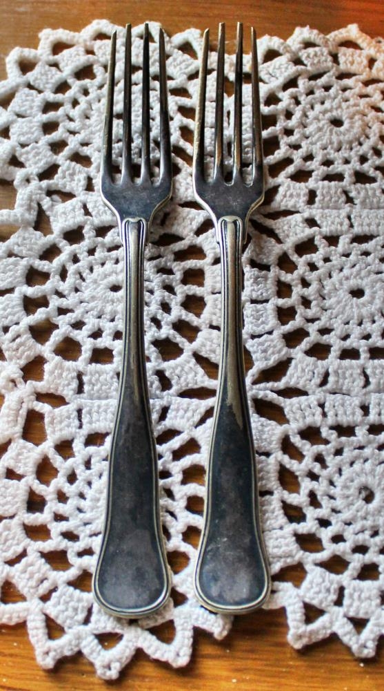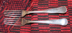 Gafflar úr silfri, fjögur stk. Lengd um 19 cm. Aftan á þeim eru fjórir stimplar, efst eru eins og tveir turnar, þá koma TB, svo P og neðst er lítill stimpill með D. Þeir eru mynstraðir á köntum miðar haldið bæði að framan og aftan.