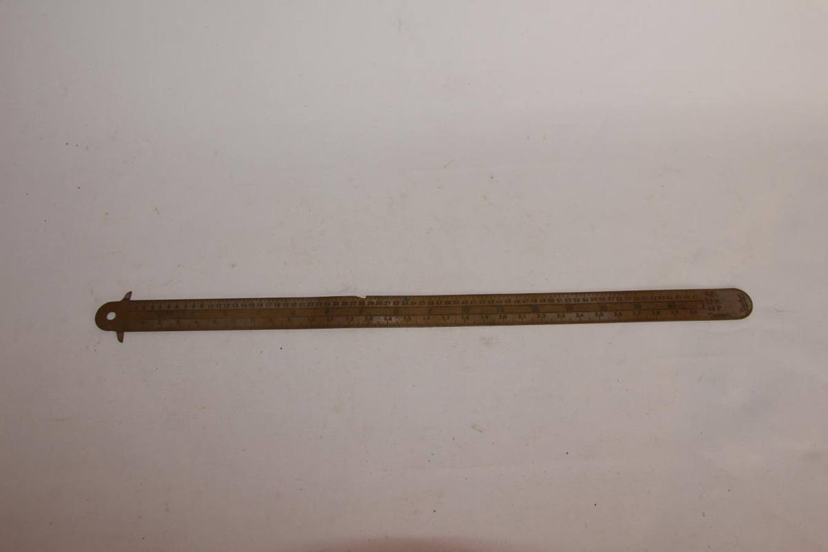 B) er úr messing, þunn, um 35 cm löng og 1,8 cm á breidd. Hún er með cm-máli, mm-máli og tommum, merkt 6 P, 12 P og 18 P öðru megin og 8 P, 9 P og 10 P hinu megin.