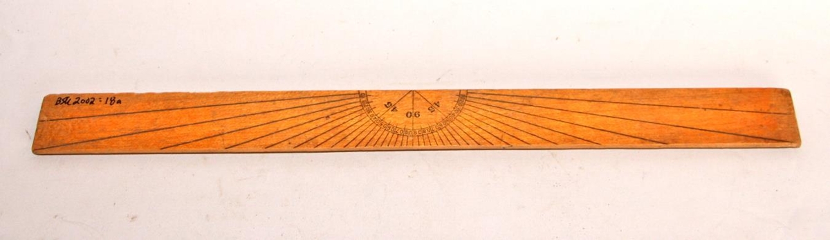 A) er úr tré, 30 cm löng og 3 cm á breidd, svolítið kúpt og með rauf öðru megin. Hinu megin eru hornmælingar.