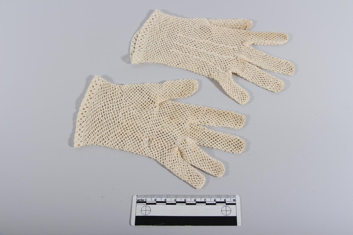 Hanskar úr netofnu hvítu efni. Lengd: 19 cm frá úlnlið á löngutöng. Vídd um úlnlið um 17 cm. Á handarbaki eru hanskarnir teknir saman með þremur saumum.