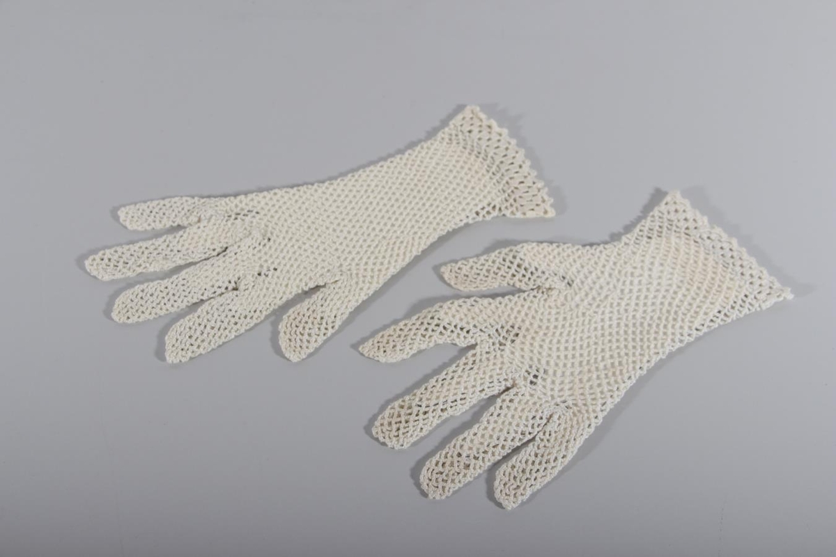 Hanskar úr netofnu hvítu efni. Lengd frá úlnlið á löngutöng er 21,3 cm. Vídd um úlnlið er um 6 cm. Hanskarnir eru einkennalausir á handarbaki. Úr búi Þóru Rósu Jóhannsdóttur (f. 17.6.1903, d. 16.6.1990) kaupakonu á Sauðárkróki. Gefandi er Hjörleifur Kristinsson á Gilsbakka.