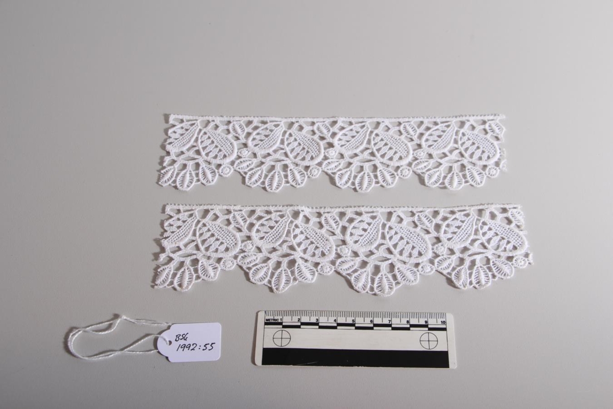 Blúnda eða kragaefni. Hreinhvít með laufmynstri. Lengd um 21 cm.