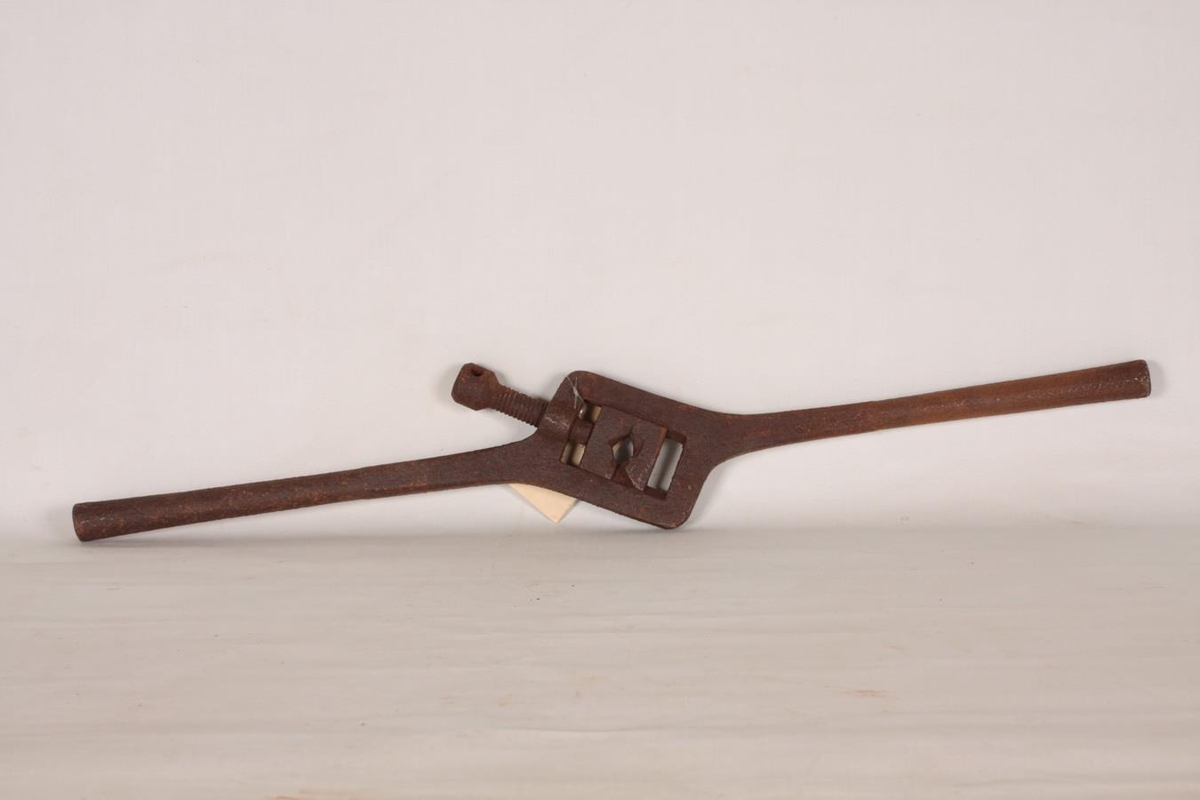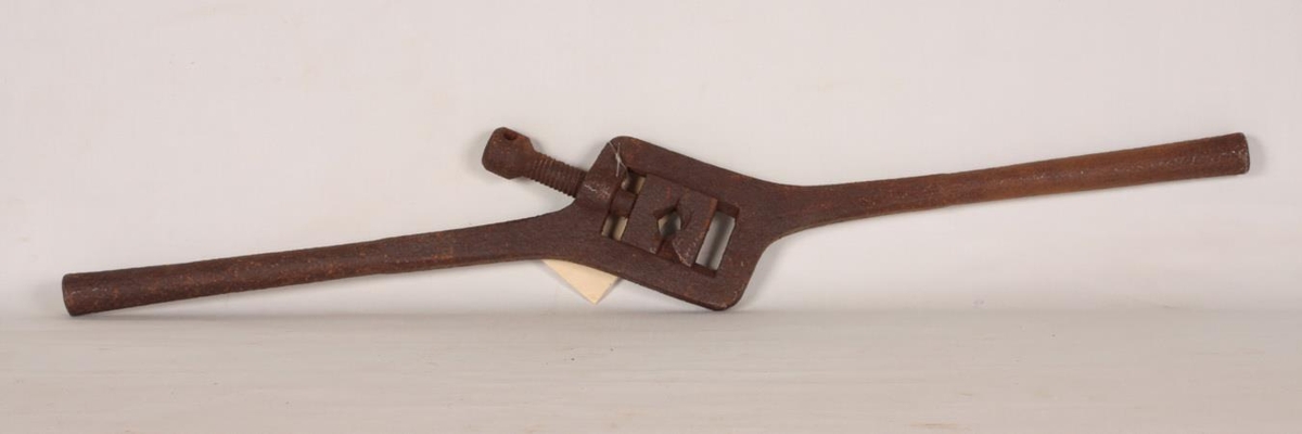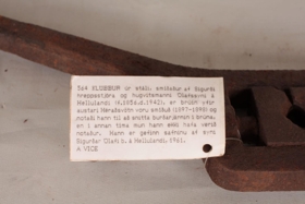 Klúbbur úr stáli, 76,2 cm að lengd. Klúbburinn er allur úr einu járni, handföngin sívöl en armarnir kantaðir er nær dregur miðju. Um miðju er klúbburinn breiðastur og er þar á honum ferhyrnt gat, um 4,7 x 7,8 cm, og liggur það sniðhallt á lengdarásinn. Í því er bakkinn, sem er í tveimur hlutum og færanlegur. Skrúfnagli með sívölum haus og gati á gengur gegnum rammann, sem er umhverfis bakkann, og með honum er bakkinn stilltur. Allur er klúbburinn og bakkinn ryðgað nú og skrúfan föst.