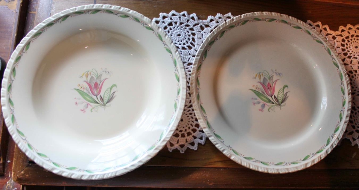 Diskar tveir, samstæðir. Djúpur og grunnur. Ljósdrappaður glerungur, barmar hamraðir og á þeim er flétta með ljósgrænu laufi og svörtum og bleikum doppum. Í botni eru blóm. Hið stærsta í miðju er bleikt og líkist túlípana með grænum og löngum blöðum, hin minni eru gul og bleik og líkjast mest holurt.