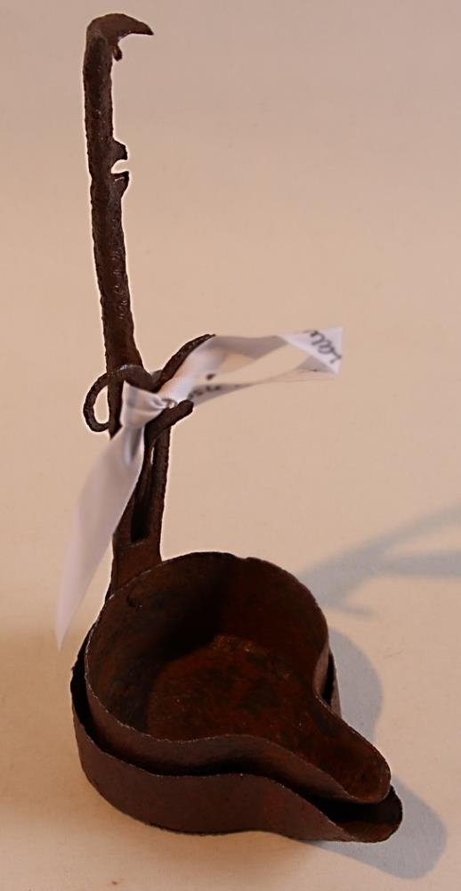 Grútarlampi úr járni. Hæð 22 cm. Lengd neðri lampa fram á stúf er 10,5 cm. Efri lampinn er hengdur upp á tanga á uppihaldinu. Skrautlykkjur ganga út frá tanganum á efri lampanum. Tanginn sem stunginn er í vegg er brotinn af, einnig er farinn fremri hluti lykkju efst á lampanum. Mjög ryðbrunninn og gamallegur.