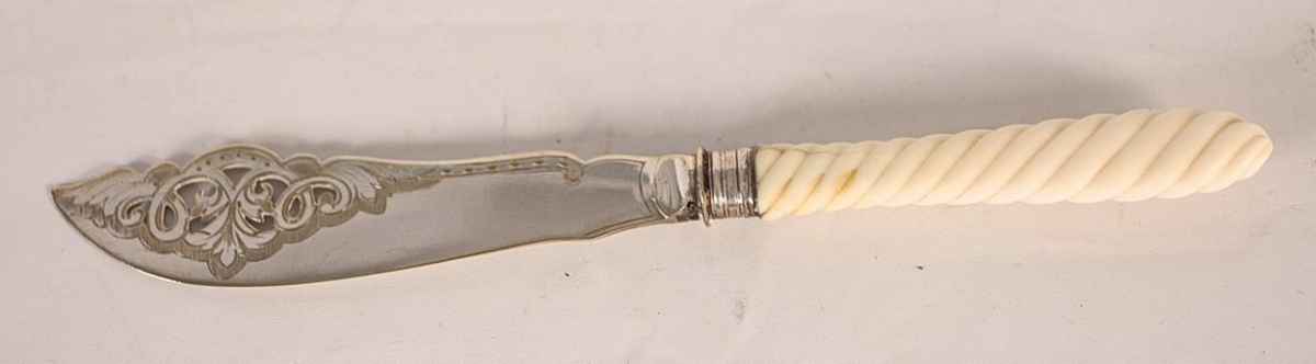 Kökuskurðarhnífur úr nýsilfri. Blaðið er 12 cm langt og breidd er 1,5-3 cm, breikkar fram, útskorið og grafið á það rósamynstur. Hlýri úr sömu málmblöndu, um 1 cm langur, gengur inn á skaftið. Skaftið er 10 cm langt, ávalt, 1,5 cm í þvermál úr beini með snúnu skurðmynstri allann hringinn. Vandaður gripur.