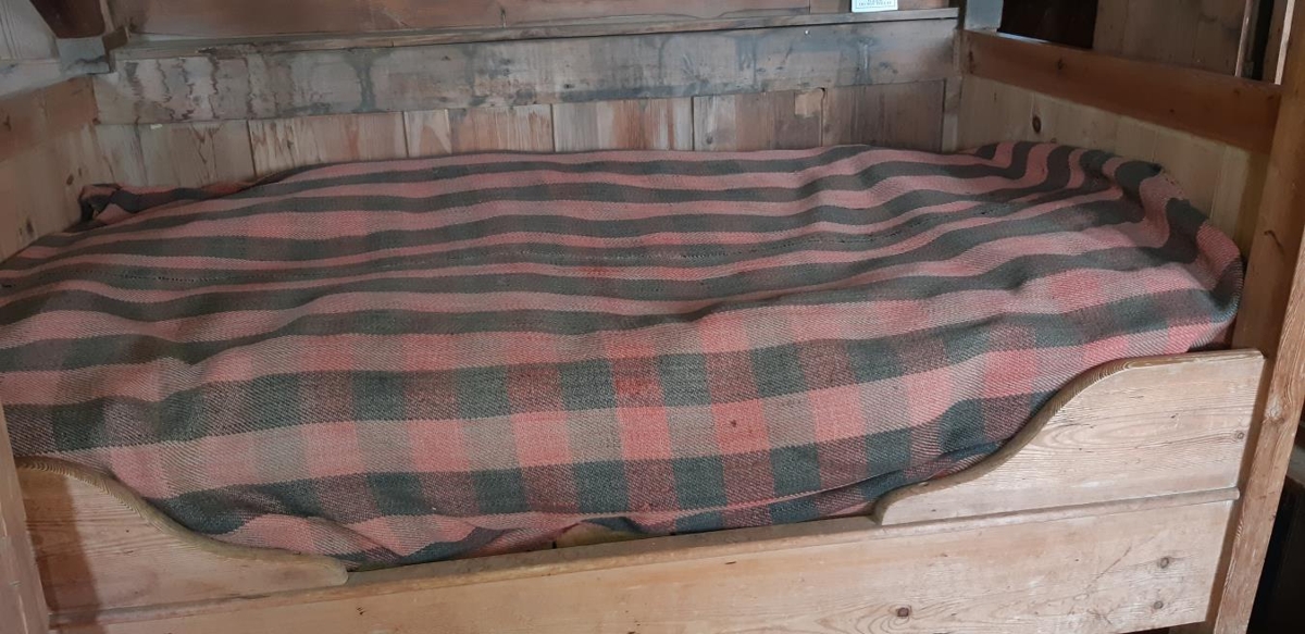 Rúmábreiða úr ull, ofin, samsettir tveir dúkar. 140 x 188 cm. Stykkjótt, rautt og svart. Báðir litirnir alltærðir af sólarljósi, komið er gat á stöku stað, en að öðru leyti er ábreiðan góð.