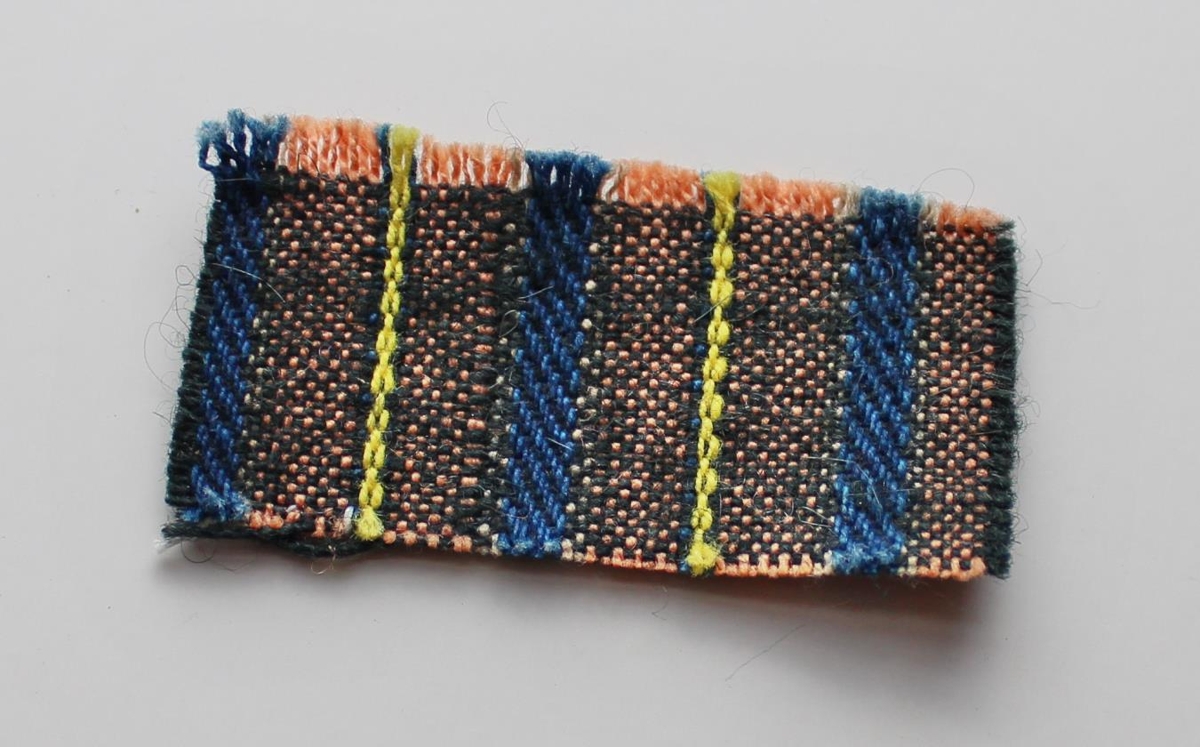 Vefnaður (sýnishorn). Ofið úr ull. Litir blár, bleikur, svartur, gulur og hvítur, bylgjótt/röndóttur: 5,1 x 2,5 cm.