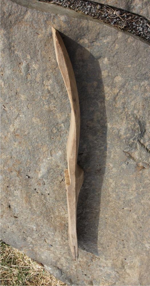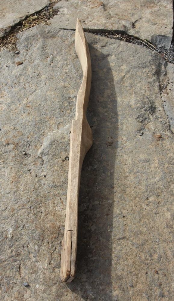 Saumatöng (leðurtöng) úr brenni, lengd 64,5 cm, breidd um 6,5 cm. Lömin úr leðri. Tanginn er brotinn af við tangarendann og töngin rifin út frá nöglunum.