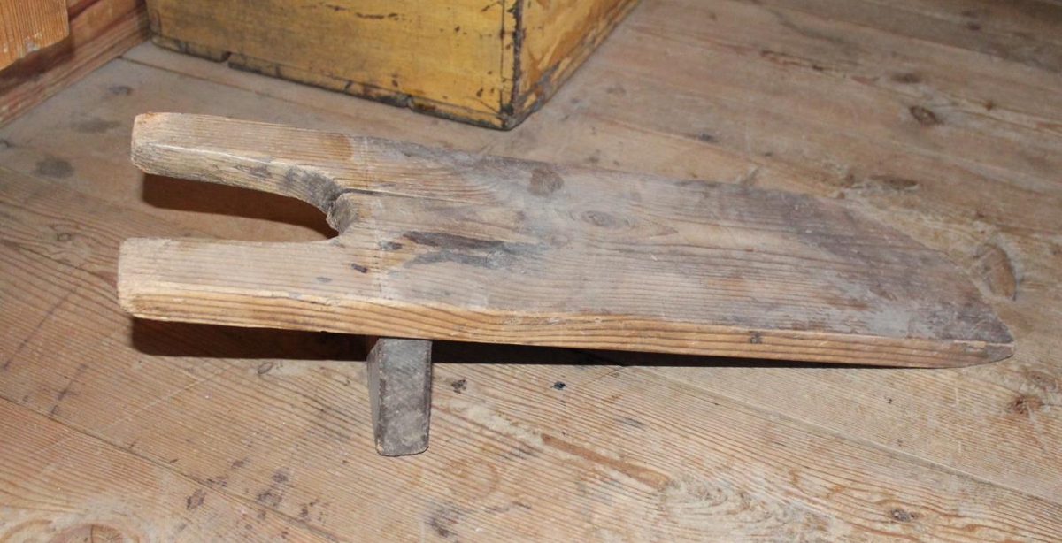 Stígvélaþræll úr furu. Lengd 46,5 cm. Þetta er fjöl sem fótur er settur undir á annan enda. Þeim megin er sporað í endann fyrir hælinn. Til að draga skó og stígvél af fótum manna.