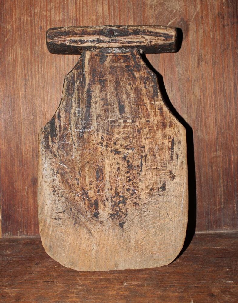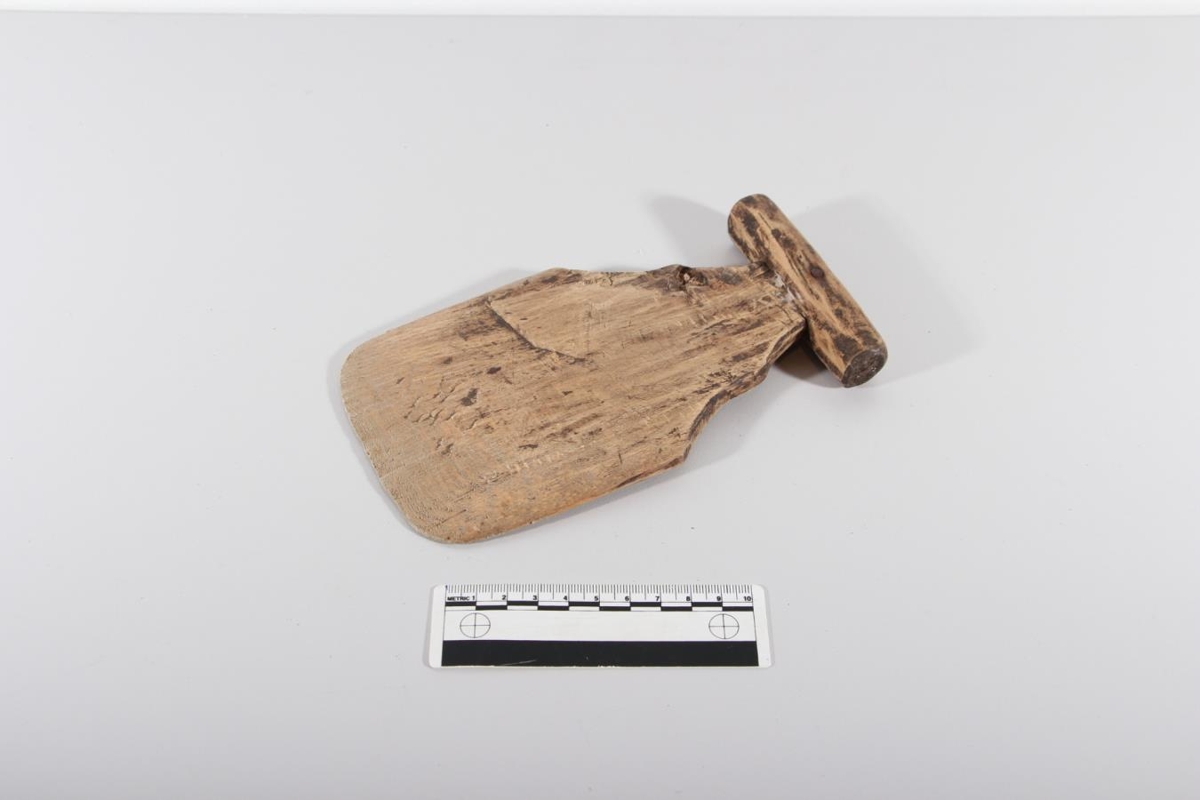 Taðspaðar, 2 stk. Úr furu. Þeir eru nánast alveg eins, þó er A ívið minni, 17 cm á lengd með haldi og blaðbreidd 10,4 cm. B er 18,5 cm á lengd með haldi og 10,7 cm breiður um blaðið. Handföngin eru stutt, A 9,5 cm langt, B 9,1 cm langt. Blöðunum er stungið í rauf á handfanginu og negld með einum járnnagla. Notað við að kljúfa tað fyrir þurrk.