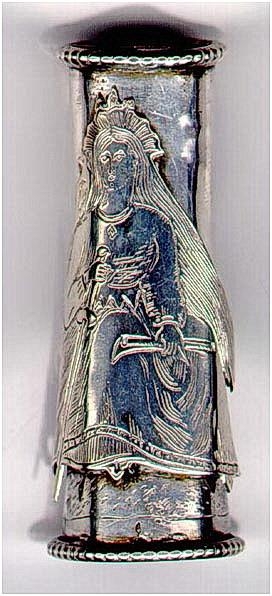 Skúfhólkur úr silfri, sívalur sléttur nema neðst, þar sem skotið belti eða borði sem nær þó ekki alveg allan hringinn. Efst og neðst eru snúrur tinaðar á barma. Á hólkinn er fest mynd af fjallkonunni, krýnd er hún með slegið sítt hár, með sverð í vinstri hendi og bókrollu í þeirri hægri. Mynd konunnar, sem er úr silfri eins og hólkurinn er fest á með krókum tveimur. Glæsilegt handbragð og samsvarandi stíll og víða sést. Hæð 5,4 cm, þvermál 1,7-2 cm.