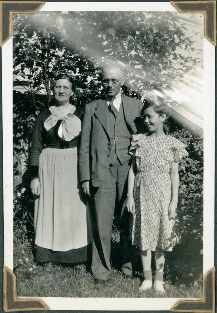 Kona á peysufötum, karlmaður á jakkafötum og stúlka í sumarkjól standa við birkitré.