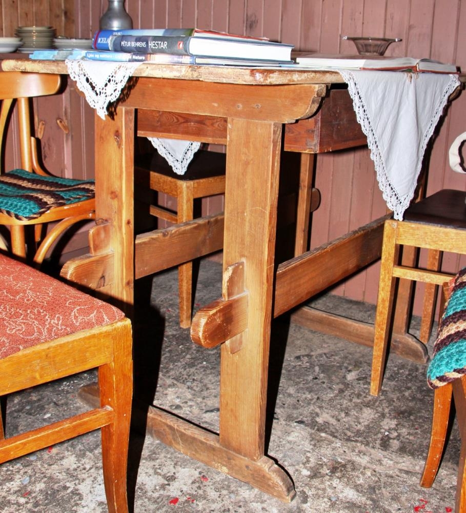 Borð með skúffu. Borðplatan er 60 x 49 cm. Hæð: 82 cm. Skúffan er 28 x 37 cm. Dýptin er 40 cm. Haldið á skúffunni er hvítt að lit úr leir, fest með járnskrúfu. Borðið er málað ljósbrúnt að lit, úr harðvið. Borðplatan er illa farin en hún er spónlögð.