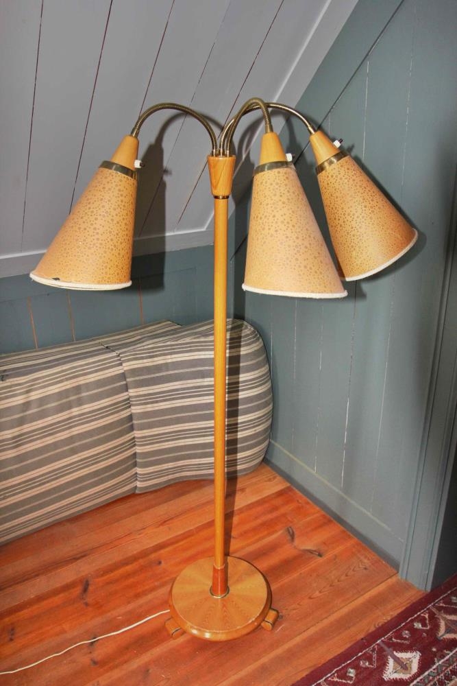Lampi úr ljósum harðvið, lökkuðum. Lengdin á lampasúlunni er 118 cm. Súlan stendur á hringlóttri tréplötu sem er 30 cm. í þvermál. Til að halda jafnvægi stendur súlan á þremur fótum, 5 cm breiðum. Lampinn hefur þrjú höfuð en skermarnir eru úr pappa. Þvermál þeirra í opið er 15,5 cm. Lampaskermarnir eru kramarhúslaga. Lampinn er sennilega frá 6. áratugnum.