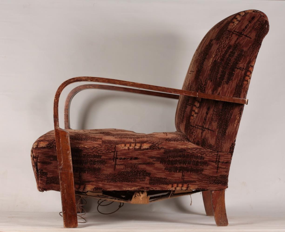 Hægindastóll. Grindin á stólnum er úr harðvið og er gormafóðrun undir honum. Áklæðið er flauel, brúnt (yrjótt) að lit, reglulega mynstrað. Armarnir eru dökkbrúnir.
