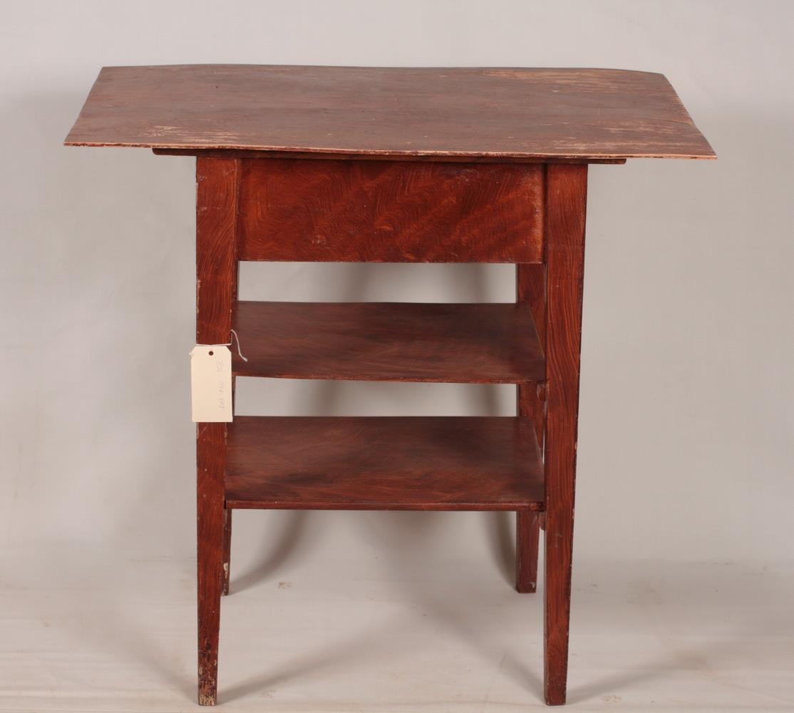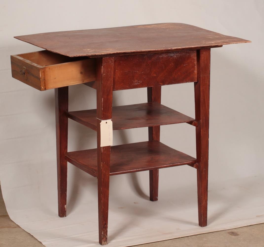 Borð úr furu, eikarmálað, rauðbrúnt. Töluvert afmáð á borðplötu. Fætur eru ferkantaðir en mjókka niður. 2 hillur eru undir skúffu, undir borðplötunni. Efri hillan er úr krossvið 42,5 x 33,2 cm. Neðri hillan er úr furu 44 x 33,8 cm. Báðar eru negldar ofaná þverspýtur sem eru festar á fætur á skammhliðum. Skúffan er opnuð út á aðra skammhliðina en hún er föst í og eins er lykillinn líka fastur í skránni. Stærð skúffunar á úthlið er 28,1 x 9 cm. Athyglisvert er að skúffan er máluð gulbrún en ekki eins og borðið sjálft sem er rauðbrúnt. Borðið er úr búi Jóns Þorsteinssonar og Jóhönnu Gísladóttir, Suðurgötu 10 á Sauðárkróki. Afhent safninu af Björgu Ragnarsdóttur og Einari Jónssyni, Langagerði 118. Reykjavík.