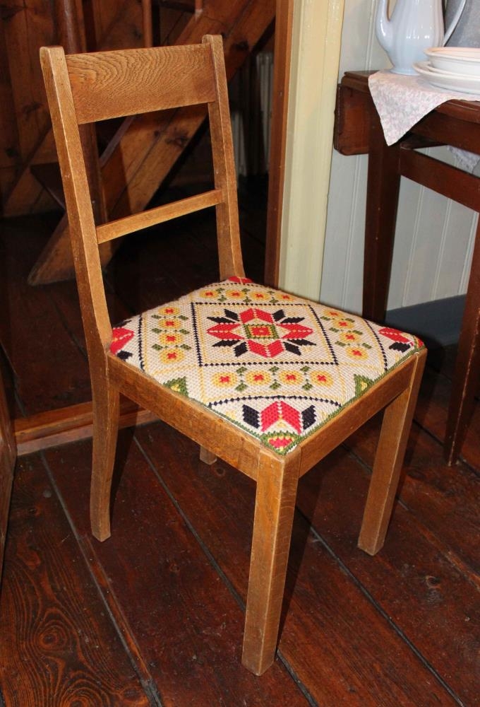 Tréstóll úr lakkaðri furu. Hæð: 88 cm. Breidd 40,5 cm. Mesta dýpt: 40,5 cm. Setan er 39 x 39 sm. Setan var í upphafi með ljósbrúnu leðurlíki eins og stóll nr. 1997: 755 en á þennan hefur verið sett áklæði, sem er saumað með krosssaumi í grófan, hvítan hörjafa. Litir: hvítt, svart, rautt og grænt. Í baki er pílári fyrir miðju, láréttur 2,5 cm. á breidd.