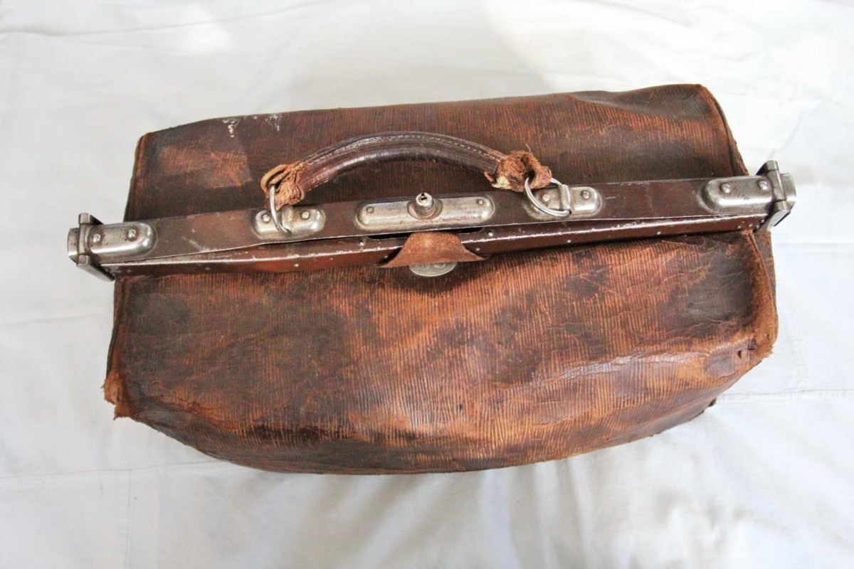 Læknataska úr leðri. Brún að lit (hefur einu sinni verið dökkbrún en er nú afmáð). Taskan er fóðruð að innan með dökkvínrauðu lérefti. Haldið á töskunni er úr leðri en læsingin úr járni, málað dökkbrúnt, töluvert afmáð.