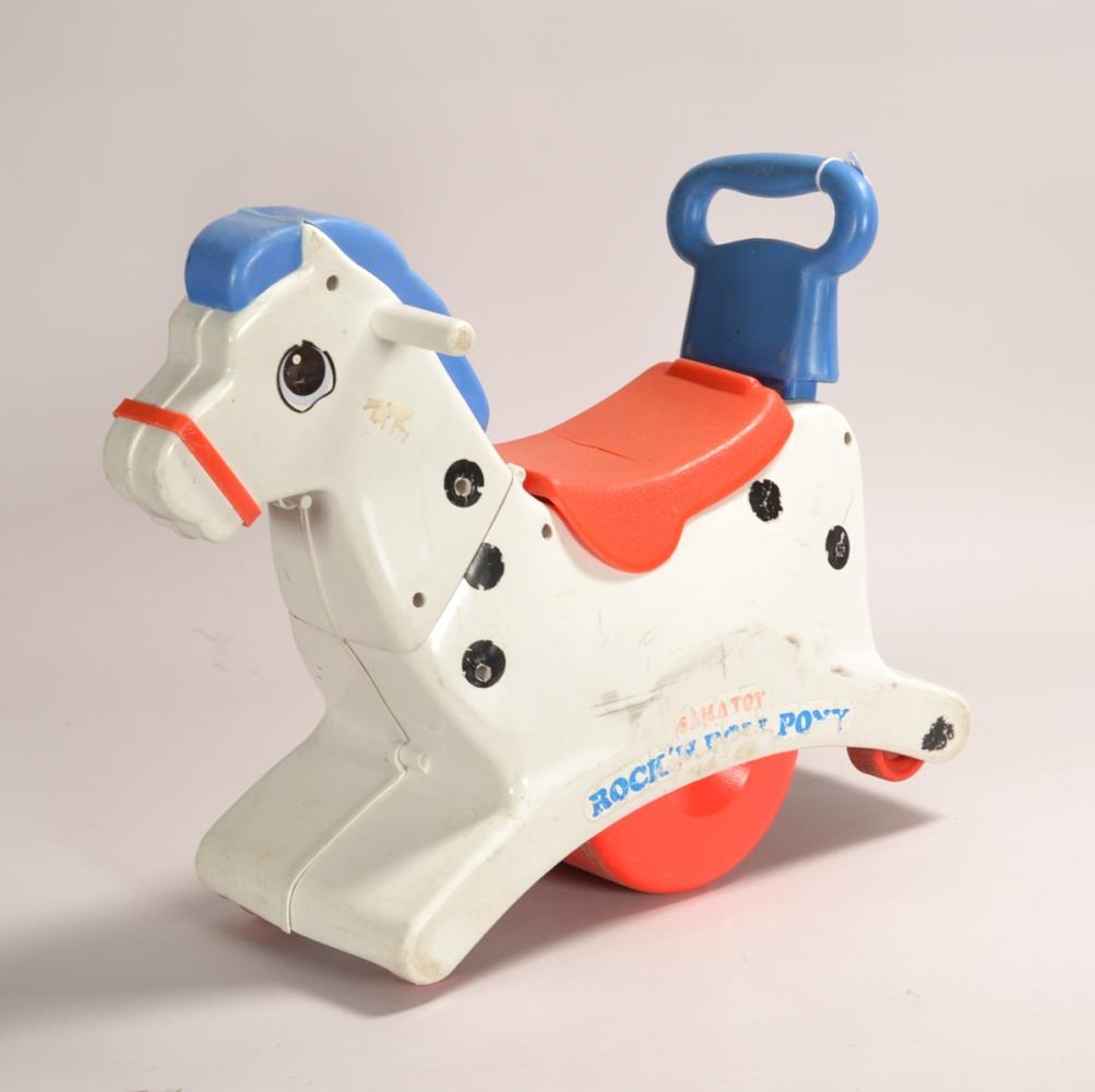 Hvítur rugguhestur með blátt fax og rauðan hnakk og á rauðum hjólum og með blátt handfang að aftan. Hægt er að ýta sér áfram á hestinum. Neðan á hestinn hefur verið skrifað „Valdimar“ með bláum tússpenna.
