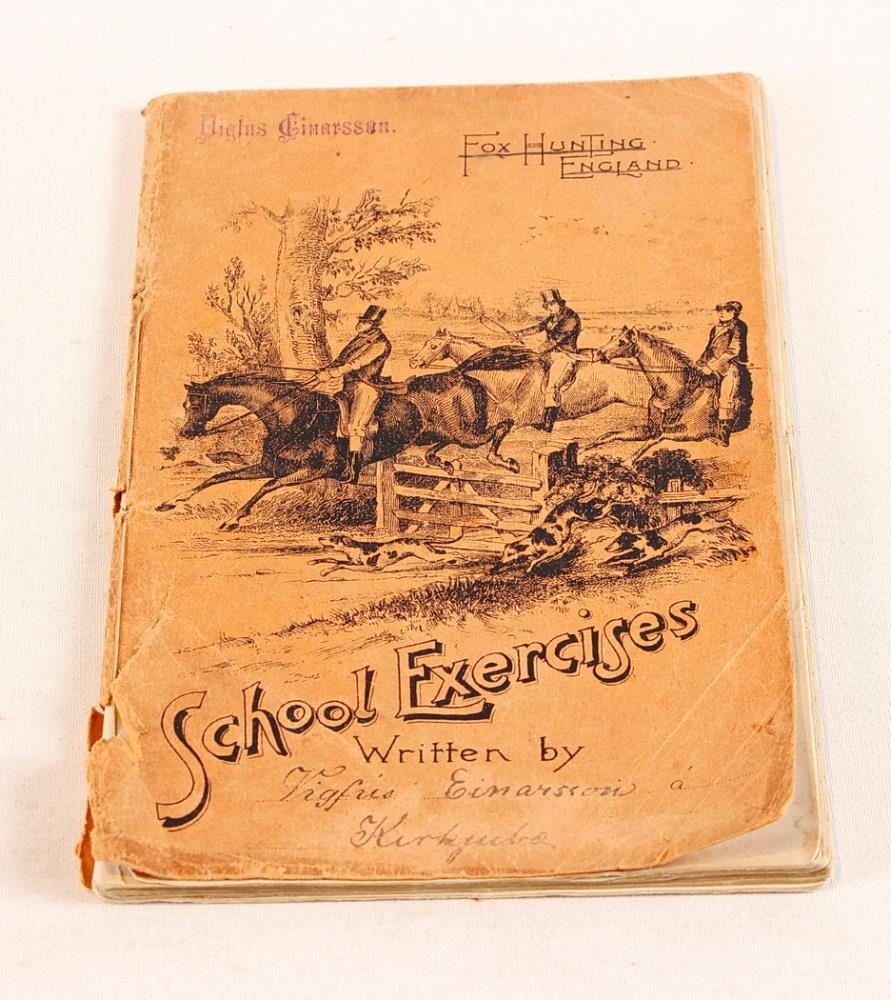Stílabók úr pappír. Appelsínugul kápa. Framaná er mynd af 3 knöpum á 3 hestum stökkvandi yfir grindverk, nokkrir hundar hlaupa með, sennilega aðallinn í Englandi á refaveiðum. Á kápunni stendur: „FOX HUNTING ENGLAND. Scool Exercises Written by: Vigfús Einarsson á Kirkjubæ". Á baksíðunni er margföldunartaflan upp í 20. og þar stendur Sigríður Einarsdóttir. Í bókinni eru Íslenskir stílar og ritgjörðir, skrifað af Vigfúsi Einarssyni á Kirkjubæ. Námsefni sem hann hefur skrifað upp til að læra utan að, hann hefur byrjað 1898.