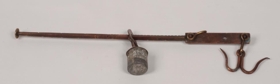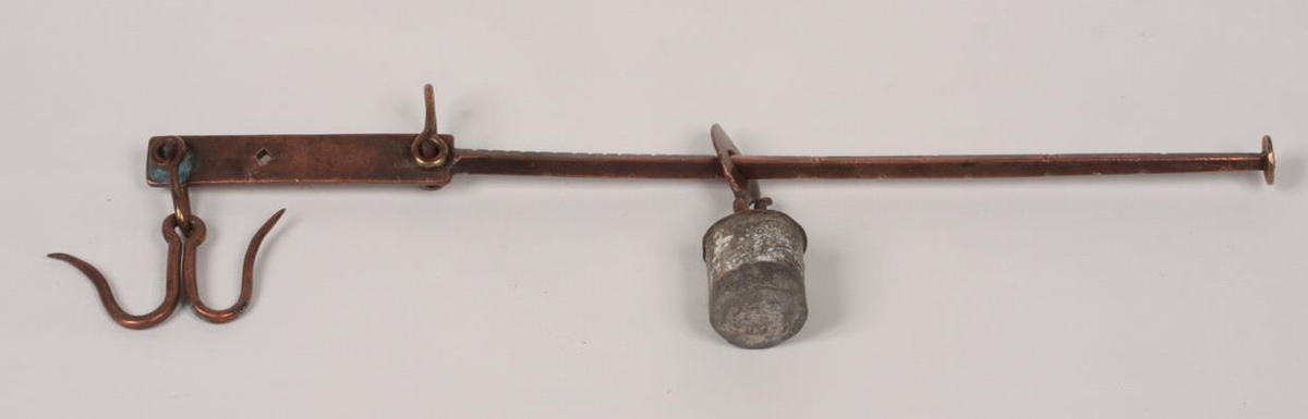 Reisla. Tanginn er úr kopar og eir. Lengd 36,7 cm. Lóðið er úr blýi, þv 3 cm. Hæð 3,2 cm. Lóðið er blýstampur steyptur neðan í eirplötu. Mjög fín smíð. Gefandi er Andrés H. Valberg. Reislan kemur frá Utanverðunesi. Sögð úr eigu Jóns Ósmanns og mun vera vinargjöf til hans frá Jónasi Kristjánsyni lækni, en þeir voru góðir vinir. Keypt utanlands að talið er. Kjöt, selspik, tólgur, smér og annað lostæti var vigtað á reislunni.