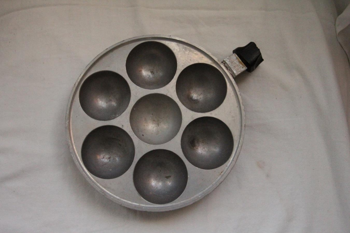 Eplaskífupanna fyrir rafmagnshellu sem er 14 cm í þvm. Hver eplaskífa er 5,5 cm í þvm. og 2,8 cm að dýpt. Hægt er að steikja sjö eplaskífur í einu.