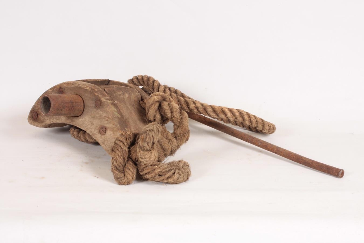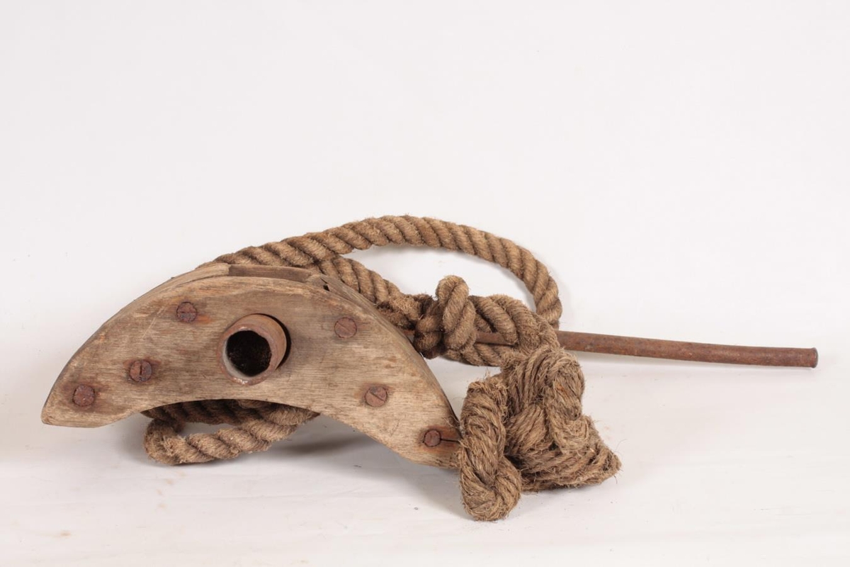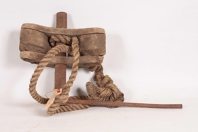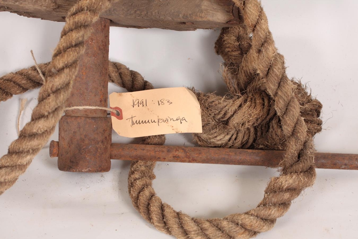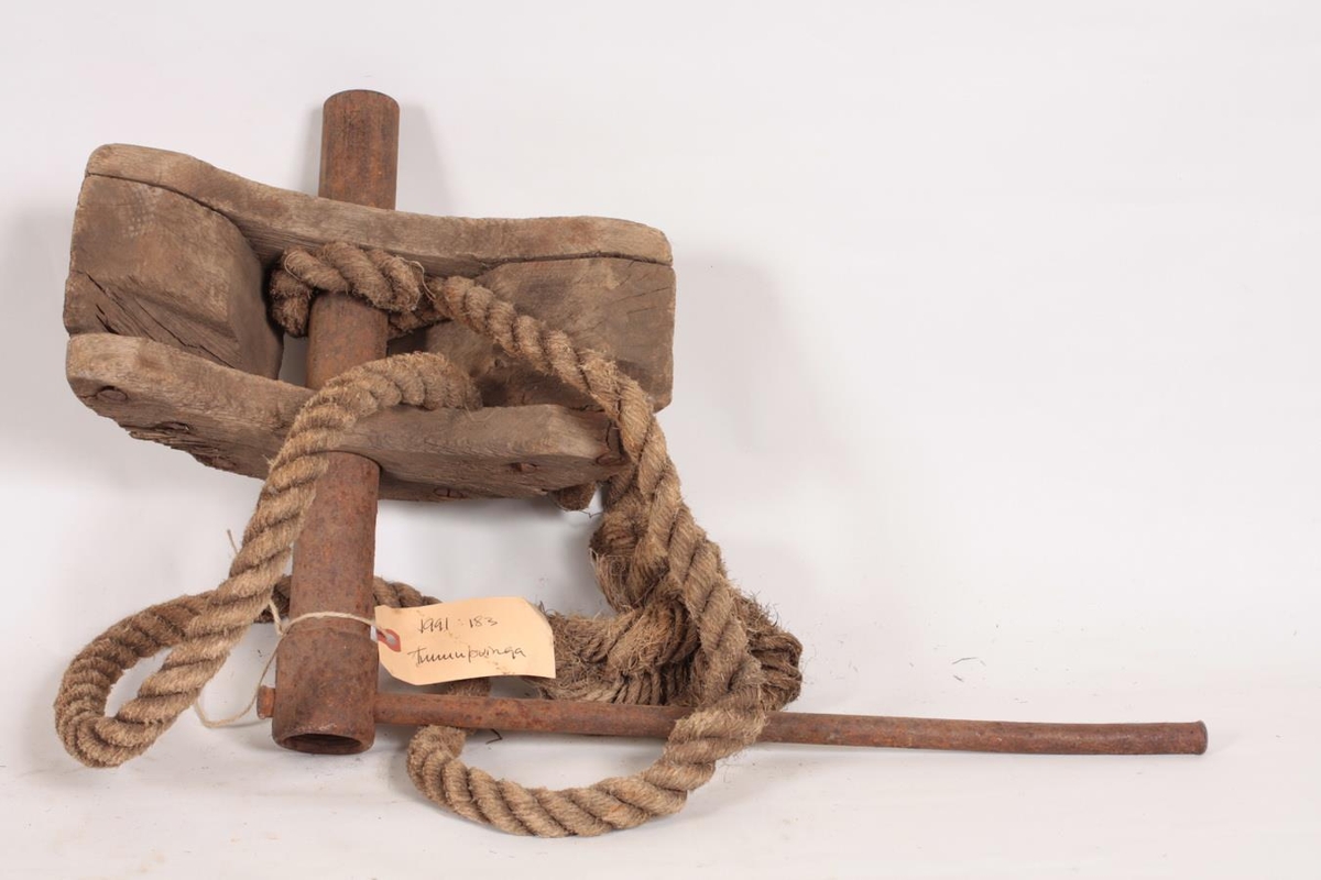 Tunnuþvinga úr furu og hampi. Þvingan er útbúin úr tréstykki (hálfmánalaga), sverum kaðli sem gengur í gegnum tréstykkið, löngum járnteini og sveif. Kaðallinn er settur utan um tunnuna og sveifinni snúið þar til herðist að stöfunum, þá er tunnan girt. Ingólfur Sveinsson, Birkihlíð 4, Sauðárkróki gaf safninu þvinguna. Hann fann hana niðri í fjöru eða á ruslahaugunum, í kringum 1960. Lengd tréstykkisins er um 31 cm og breidd um 13,5 cm. Sveifin er 36 cm og haldið 43 cm.