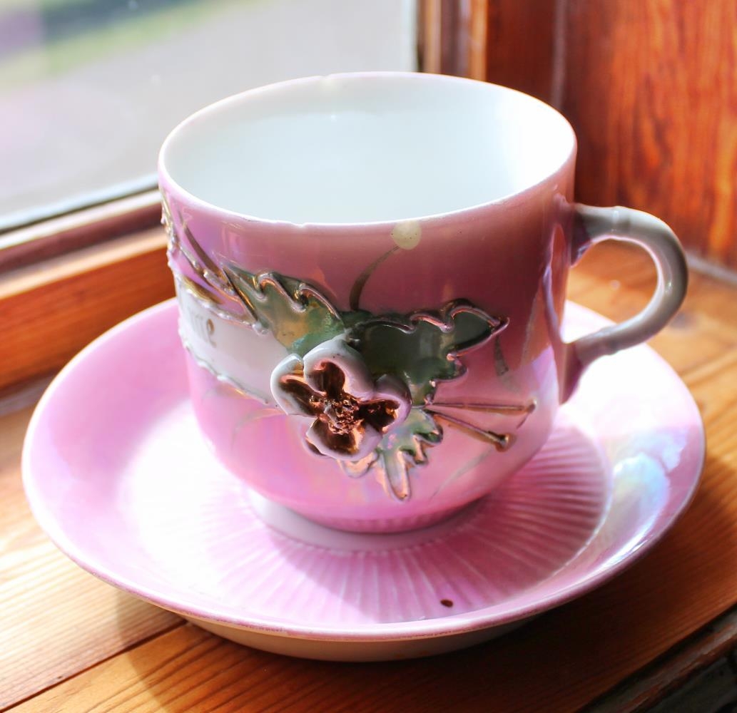 Bollapar úr postulíni, fremur stór bolli, þvermál 8,2 cm, hæð 8 cm. Undirskálin er 15 cm. Lituð bleik að utan og ofan. Á bollanum er ásteypt rós, blöð og blóm eru með gyllingu, blöðin eru einnig með grænum lit. Hvítur borði liggur út frá blóminu. Á honum stendur: Think of me. Neðan á bollanum er stimplað númerið 37. Önnur einkenni eru ekki, hvorki á bolla né undirskál. Eyrað er hvítt og fremur pent.