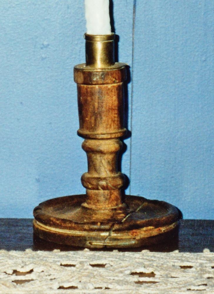 Kertapípa (kertastjaki) renndur úr brenni, með látúnspípu efst. Hæðin er alls 14,7 cm og stéttin 10,7 cm í þvermál og hvilft í hana umhverfis að ofan. Efri hlutinn renndur úr öðru tré, 2,2-3,9 cm að gildleika. Rifa er á hlið látúnspípunnar, og virðist þar vanta í stykkki. Stéttin er rifin og spengd síðan og víða eru brunablettir.