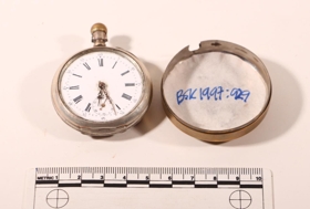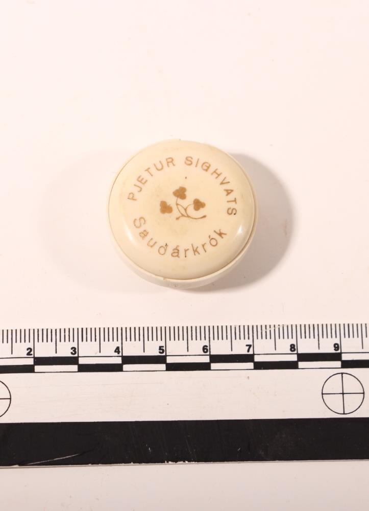 Umbúðir úr plasti, hvítt á litinn. Undan glerjum í vasaúr. Þvermál 3,5 cm. Hæð u.þ.b. 1 cm. Á botninum stendur Pjetur Sighvats Sauðárkrók með gylltum stöfum. En á lokinu er gagnsætt plast 2,3 cm í þvermál. Boxið er frá því fyrir 1940.
