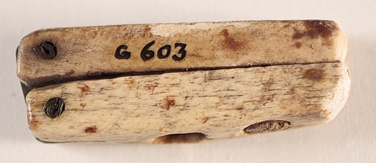 Í annan endann er felld tvöföld látúnsplata sem myndar lamir milli beinhelminganna. Um miðju er gat í gegnum þá báða. Litlu ofar eru eins göt með trétöppum í. Slitför í endanum, líkt og er oft á klömbrum. Virðist allgamalt.