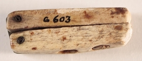 Klömbrur úr hvalbeini (skrúfstykki). Hlutur þessi er gerður af tveimur helmingum er falla saman, og er lengd hlutarins þá um 6,5 cm, breiddin um 1,6 cm og þykktin 2,3 cm.