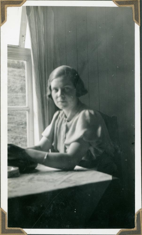 Ung kona situr við borð hjá glugga. Sigríður Klemenzdóttir.