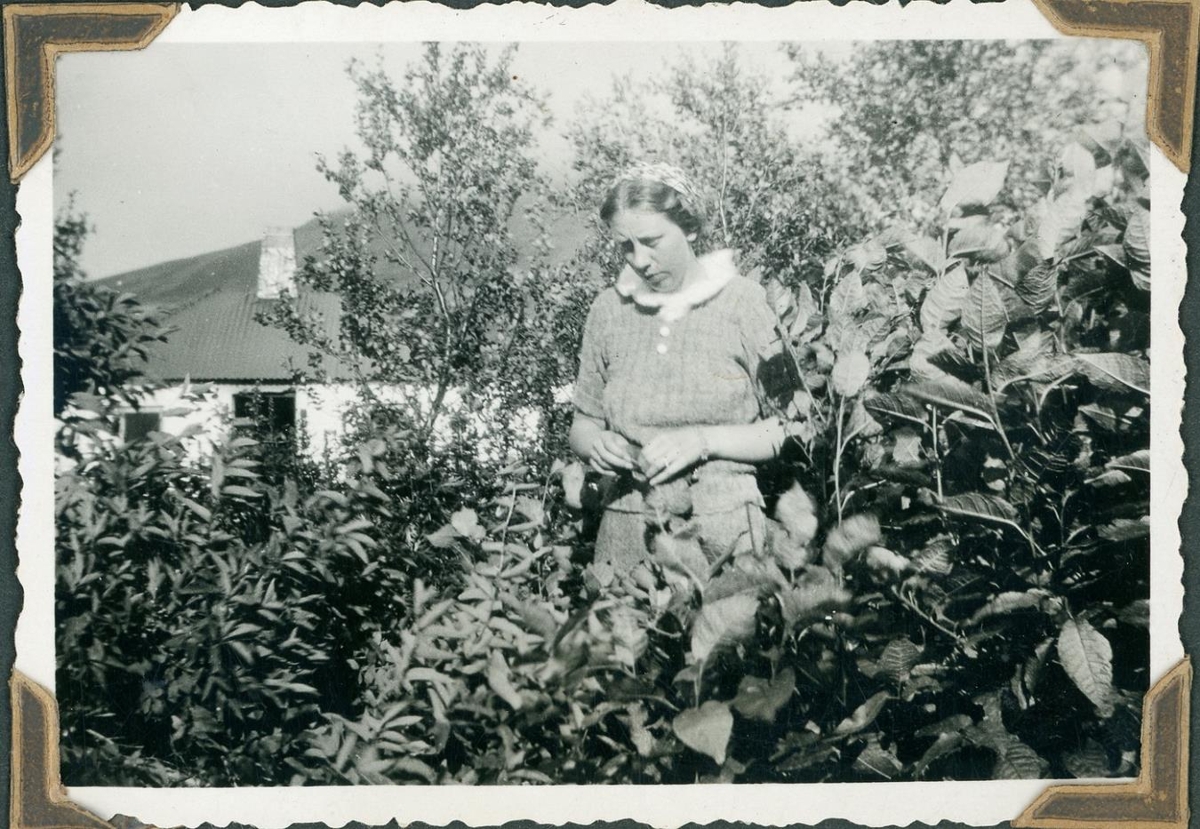 Ung kona stendur við runna, hús í baksýn. Unnur Páslsdóttir.