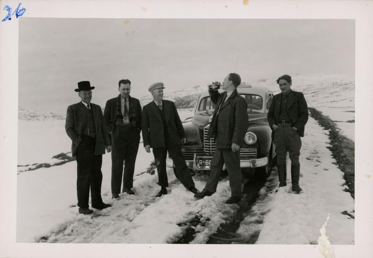 Frá vinstri. Daníel Tómasson á Kollsá, Haraldur B. Guðmundsson, Vignir og Helgi Einarssynir frá Hróðnýjarstöðum og Geiri Júlíusson á ferð milli Ljárskóga og Hróðnýjarstaða.