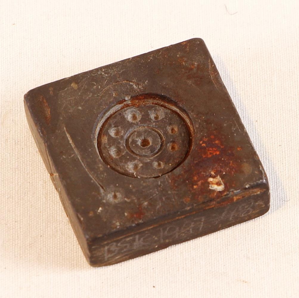 Hnappamót (steypumót). Úr heinsteini. Stærð 3,6 x 3,6 x 1 cm. Mót fyrir tvær tölur sitt hvoru megin. Á annarri hliðinni er lítill hringur. Úr eigu Sigurðar Norland í Hindisvík.