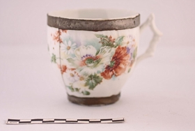 Skeggbolli, hvítt postulín með blómamynstri; hvít og okkurrauð blóm, sór og smá, með grænum laufblöðum. Eyrað er hyrnt og bæði botn og barmar eru sprengd. Ástæða þess er að bollinn er sprunginn; hann hefur hrokkið í tvennt en spengingin hefur dugað vel og hann verið notaður síðan.