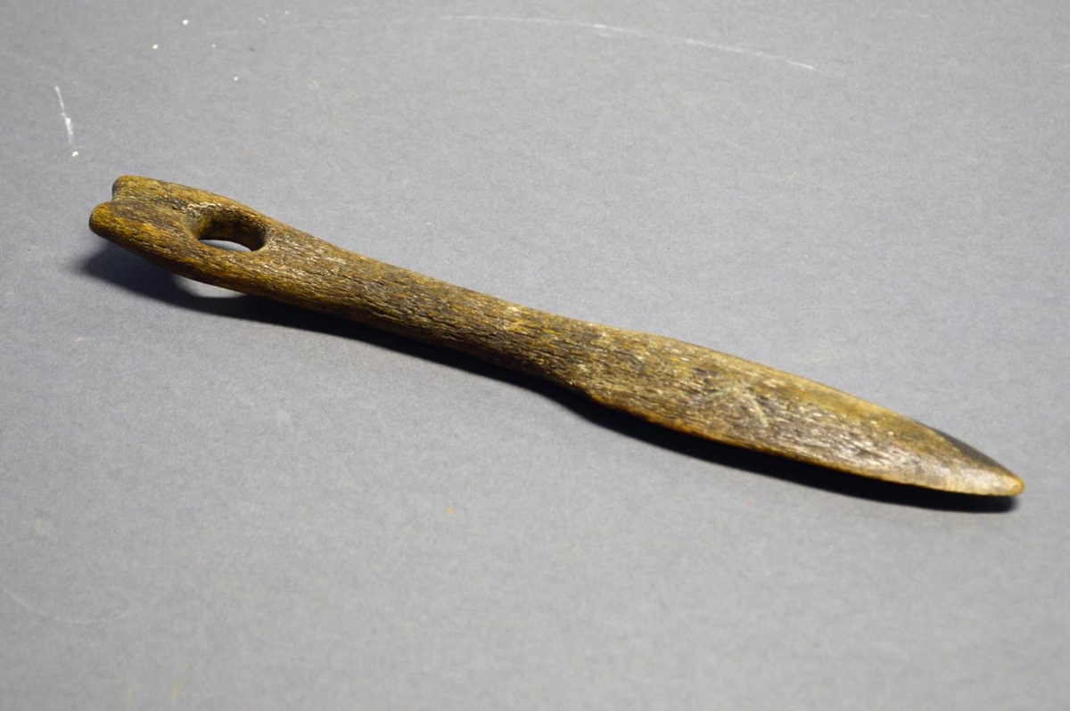 Seilarnál úr hvalbeini, mjög forn. Merkingar: Annarsvegar rúnin m og hinsvegar M og E.E. Einar Einarsson bóndi á Strönd. L 25